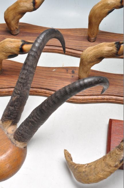 Of Taxidermy interest - A collection of early 20th century taxidermy to include two animal hoof coat racks having an oak back panel, a set of ram horns mounted on a wooden back plate together with another pair of animal horns.  Measures 53cm long.