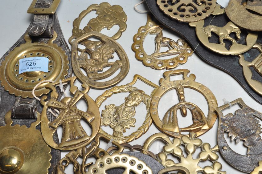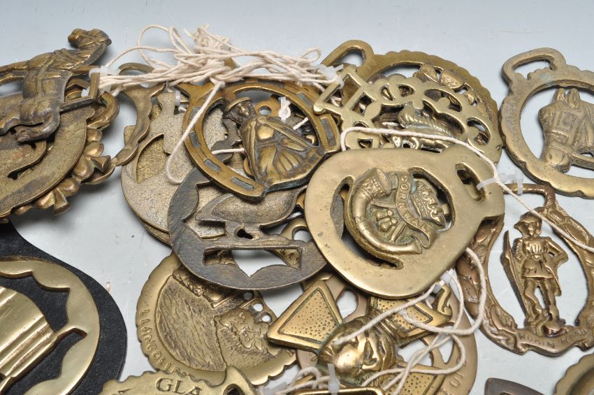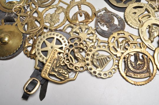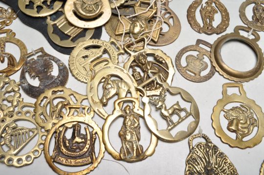 A large collection of early 20th century decorative horse brasses of various designs and themes. Mainly English horse brasses.