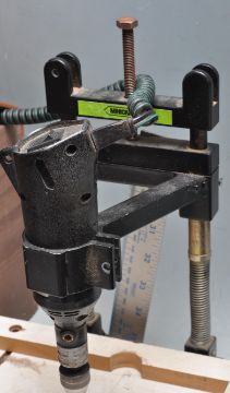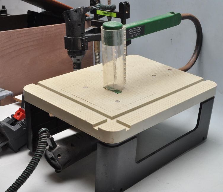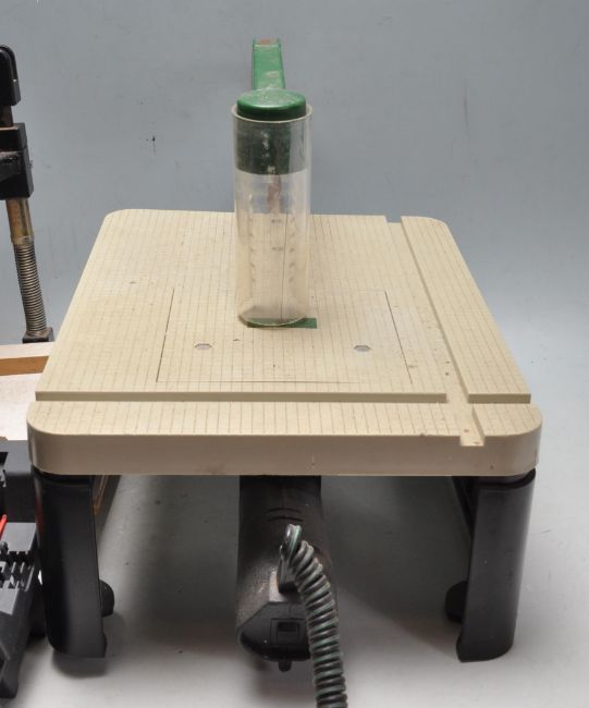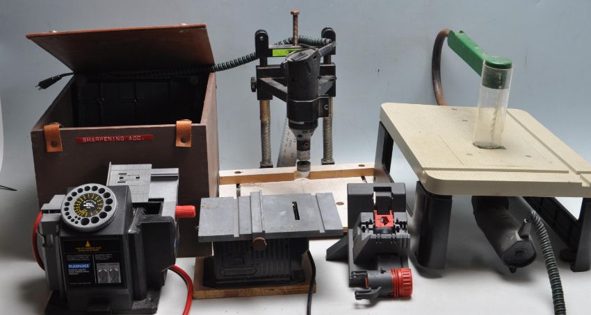 A collection of contemporary precision model making equipment tools including a table drill, The Chopper, table jigsaw, Plasplugs tabletop drill bit sharpener and more.