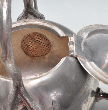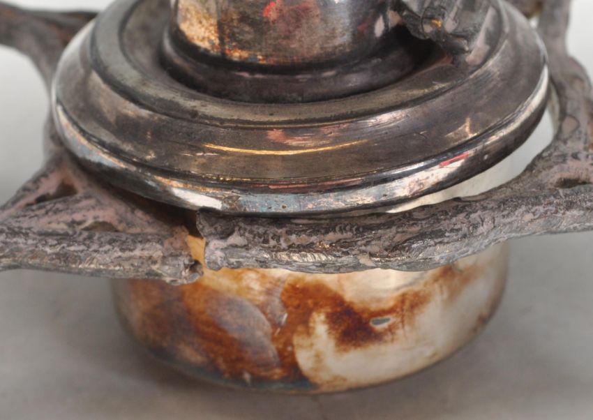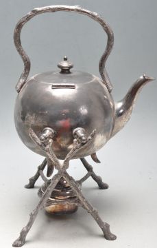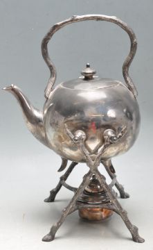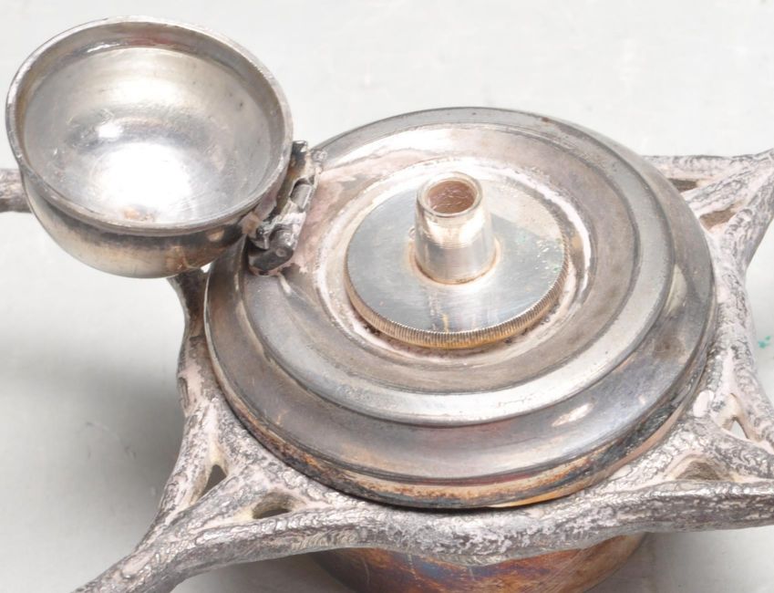 An antique early 20th century silver plated spirit kettle having a wood effect handle and stand. Makers mark to the base. Bearing hallmarks for John Turton & Co, Sheffield. 12cm high.