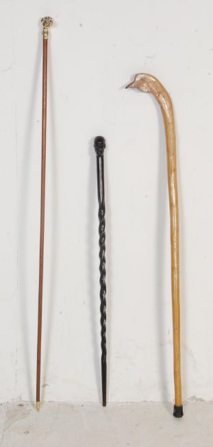 A collection of three vintage 20th century walking sticks comprising of an African hardwood cane with a mans head and barley twist shaft, a wooden cane with a yellow metal handle in the form of a Boxer dog and a shaft doubling as a measuring tape together with another cane having a carved birds head Measures, 128 cm Tall