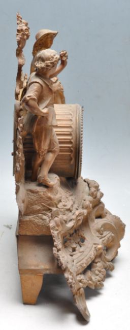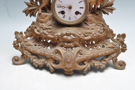 An early 20th century French garniture mantel clock having a white enamel clock face, roman numerals to the chapter ring flanked by a courting couple culminating in a floral embellishment raised on scrolled feet. 33cm high.
