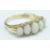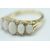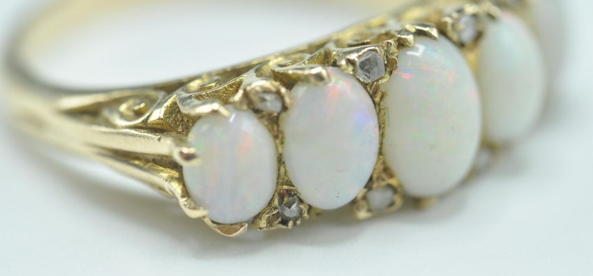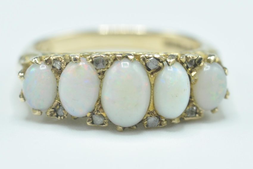 A hallmarked 9ct gold five stone ring set with five graduating oval opal cabochons with diamond accent stones set to the head, set within a decorative scrolled mount. Hallmarked London 1969. Weight 4.9g. Size O.5.