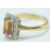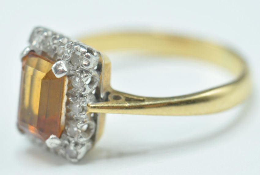 A 20th Century 18ct gold ring set with a rectangular cut citrine in a platinum mount with a halo of diamond accent stones. Band marked 18ct and platinum. Weight 3.0g. Size J.