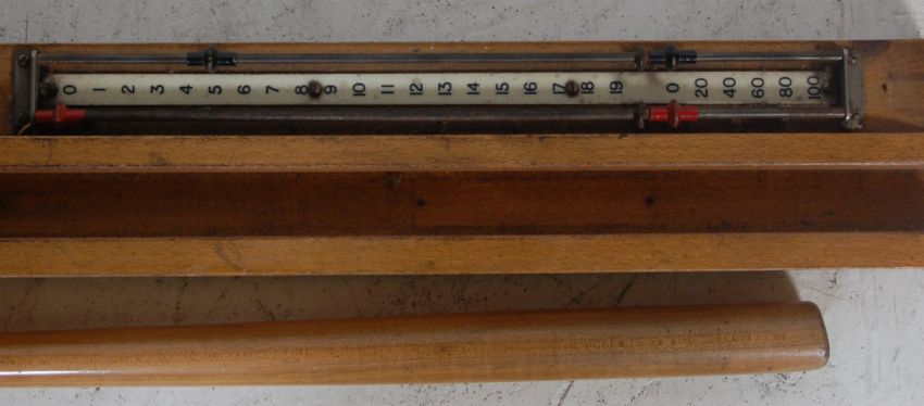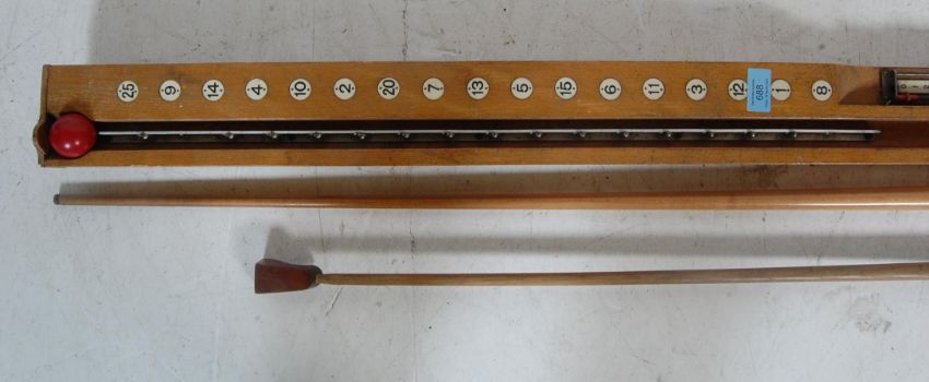A rare mid century tabletop ball game of a long rectangular form having a circular Arabic numerals score levels, white score board, red billiard ball and a cube. No makers marks on the game. Cube marked E.J. Riley LTD.Measures, 113 cm Long