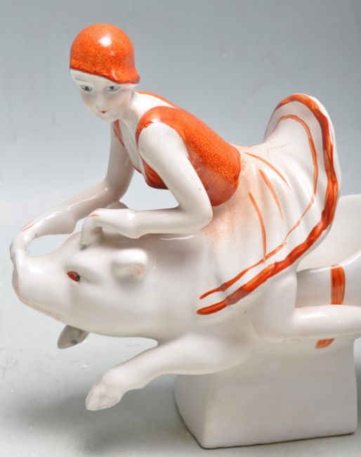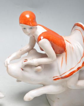 A pair of vintage style Art Deco revival ceramic bookends having two flapper girls riding pigs. The bookends have a cream background with orange embellishments. Measures 10cm tall