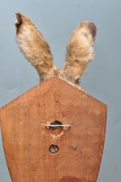 Of taxidermy interest - A vintage late 20th century mounted hares head (Lepus Europaeus). Brass legend reads caught by Queenie Willimoteswick January 1973. Measures 36cm high.