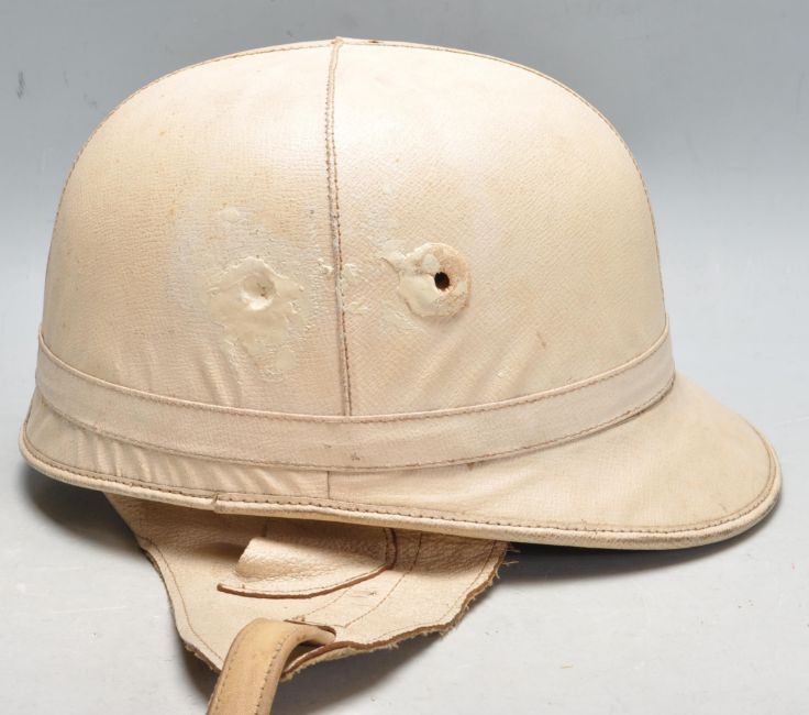 A vintage mid century automotive interest “The Corker” motorcycle / motorbike helmet by J. Compton, Sons & Webb LTD having cork inlaid and white leather strap. Size 6 7/8.
