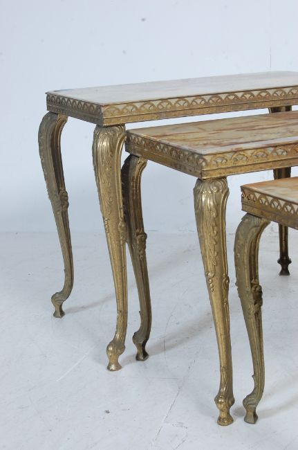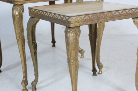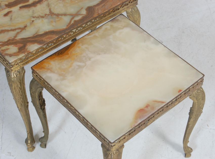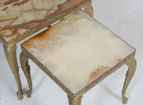 A retro vintage 1970s Italian alabaster and brass nest of graduating tables of rectangular form having curved supports with floral embellishments to the corners.Measures, 44 cm H x 50 cm W x 30 cm D