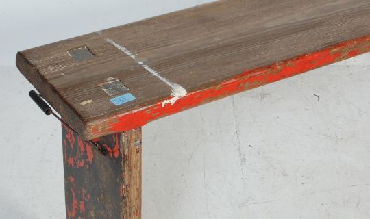 An early 20th century country elm wood refectory type pig bench of typical form having remains of paint work. The bench being raised on squared legs with pierced centres,Measures, 50 cm H x 130 cm W x 28 cm D