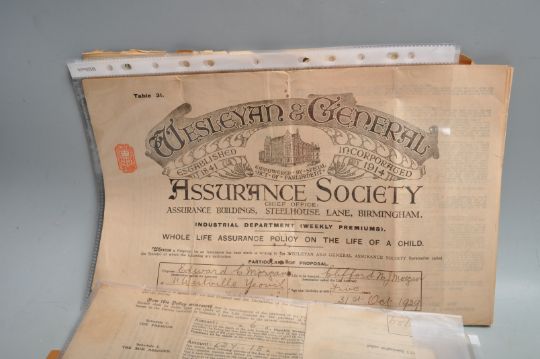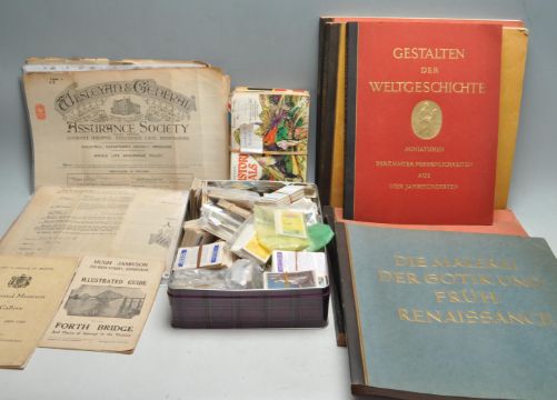 A collection of various mixed ephemera to include a selection of German art reference books, most being complete with stick in coloured illustrations (two without) including; Dei Malerei der Renaissance, Die Malerei Des Barock, Die Maerei Der Gotik und Fruh-Renaissance and Gestalten der Weltgeschichte. Together with a selection of 1930's Assurance policies and a selection of mixed brooke bond and cigarette cards.
