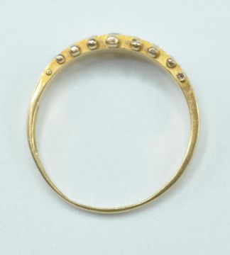An early 20th century 18ct gold and half pearl ring. The ring with channel set half pearls to plain tapering shank af. Stamped GB18CT. Total weight 2.39g / Size 0