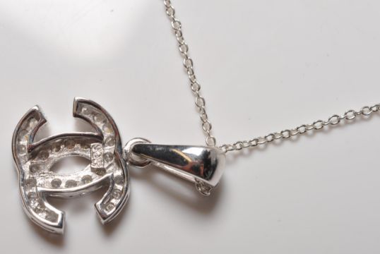 A stamped .925 sterling silver Chanel style necklace studded with CZ stones. Comes with a stamped .925 with a lobster clasp. Chain is 44cm high. Gross weight 7.5g