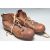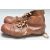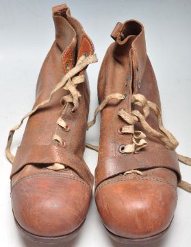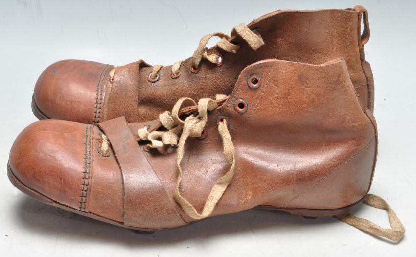 A pair of 1930’s brown leather football / rugby boots size 6 with white laces and six studs to the sole. 29cm high