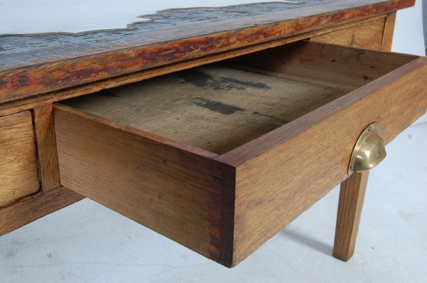 A large and incredible 1930’s George VI Air Ministry type desk of a rectangular form with three short drawers to the front having the original brass handles stamped G R, raised on square legs.Measures, 76 cm H x 152 cm W x 90 cm D