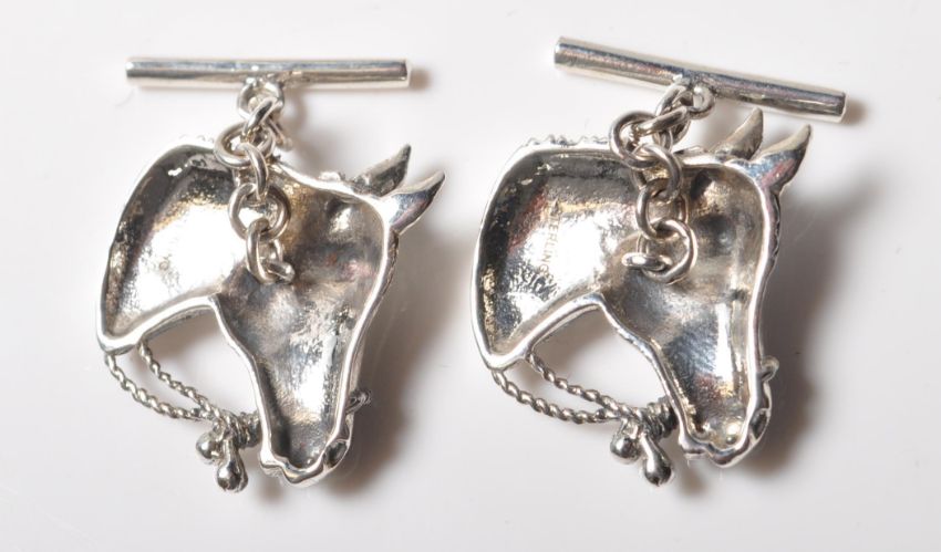 A pair of stamped sterling silver cufflinks in the shape of a racing horses head. Measures 22mm wide. Gross weight 10.6g