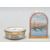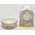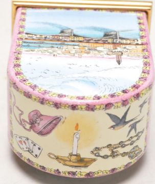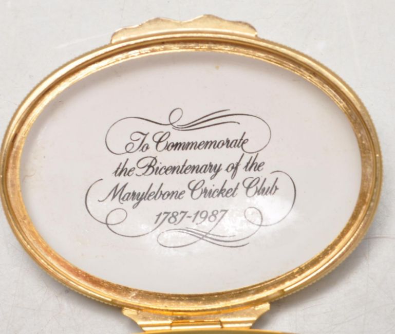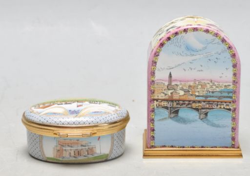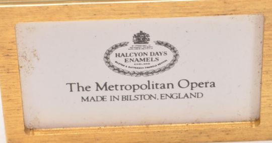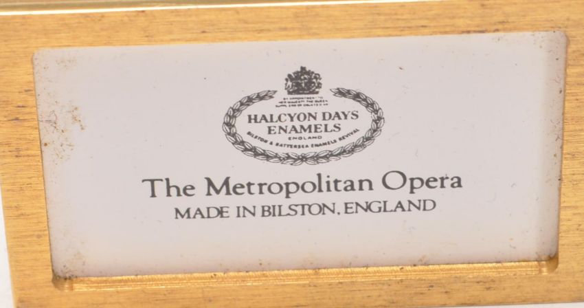 A collection of two Halcyon days cabinet enamel ware to include a miniature Halcyon days clock “ The Metropolitan opera “ having oriental scene to the front panel and continental scene to the back together with a Halcyon pill box of an oval form having cricket scene to the hinged lid. Makers stamp to the underside.