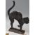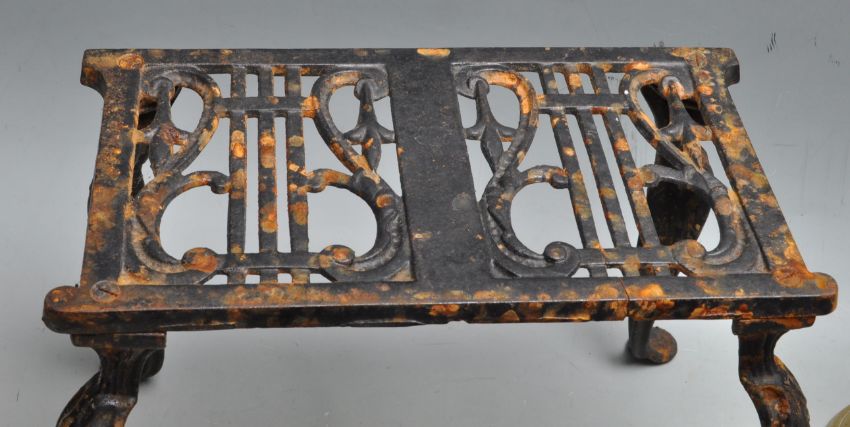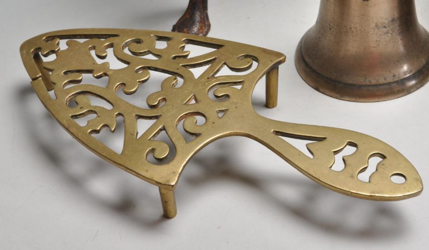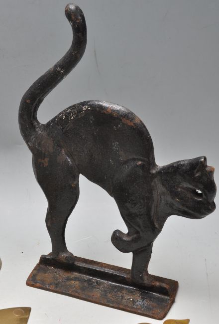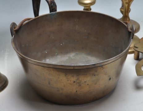 A large collection of antique 19th century and later brass and cast metal items to include a large brass jam pan / brass bell stamped B.10, trivets, candlesticks, black cat cast metal figure, etc.
