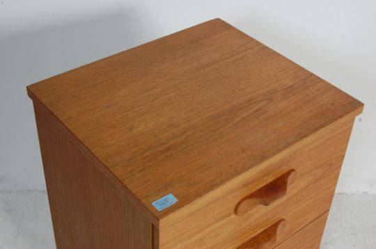 A small vintage 20th century teak wood veneer austinsuite pedestal chest of drawers / bedside cabinet having four drawers with wooden shaped handles raised on plinth base with casters.Measures, 70 cm H x 50 cm W x 44 cm D