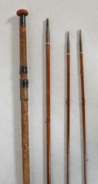 A vintage early 20th century P.D. Malloch wooden modular fishing rod having three sections with a pare top section along with two Leeda RimFly fishing reels.