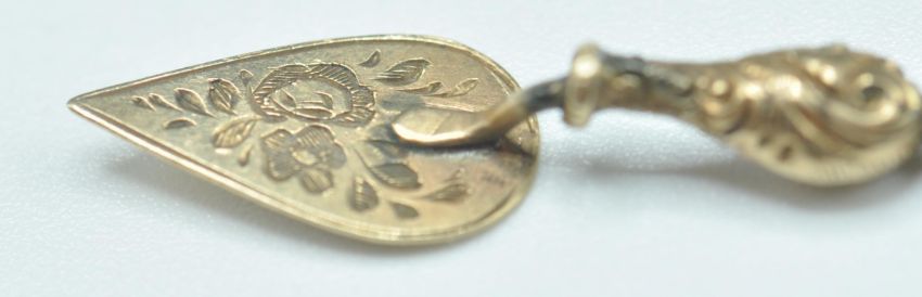 An antique 9ct gold Masonic trowel charm having engraved floral decoration and square and compasses to the verso. Unmarked but tests as 9ct gold. Weight 0.6g. Measures 2.9cm including bale.