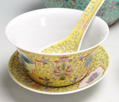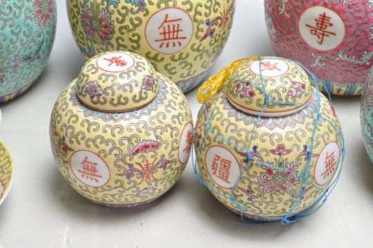 A large and impressive collection of early 20th century Chinese oriental ceramic ginger jars of various sizes and patterns to include two Famille Rose pattern together with a bowl rice, spoon and small plate, four Famille Jaune together with a rice bowl, spoon and small plate and two Famille Verte. 17cm high