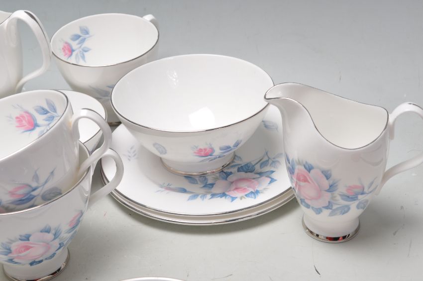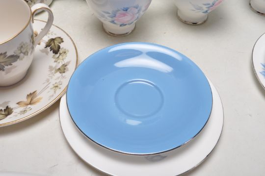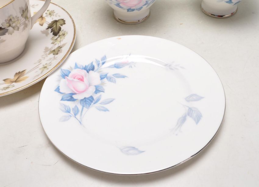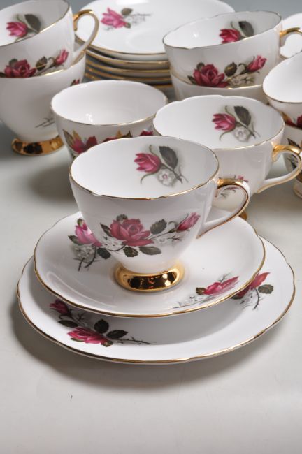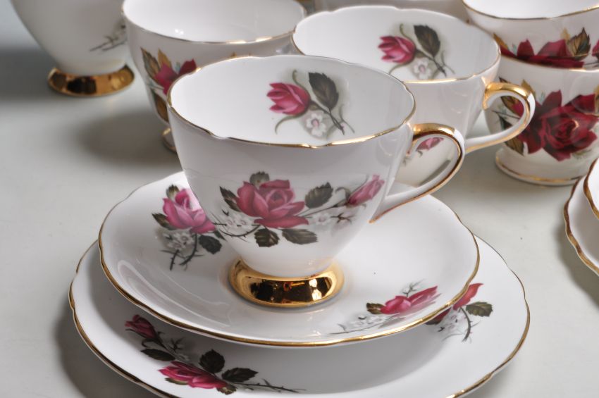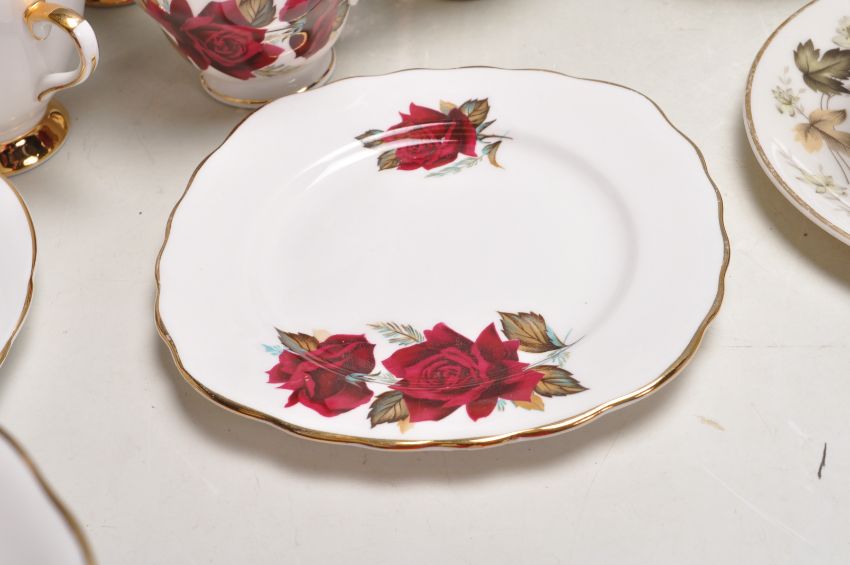 A collection of vintage English fine bone china tea sets to include a Royal Doulton Larchmont tea for one service, Royal Vale - Red roses trios comprising of cups, saucers and cake plates, Royal Albert Sorrento various bits, Royal Ascot, etc.