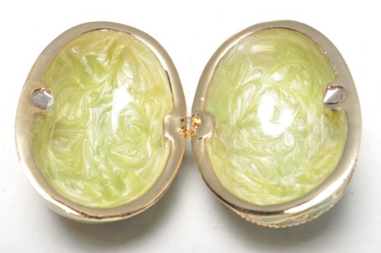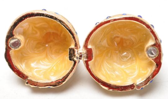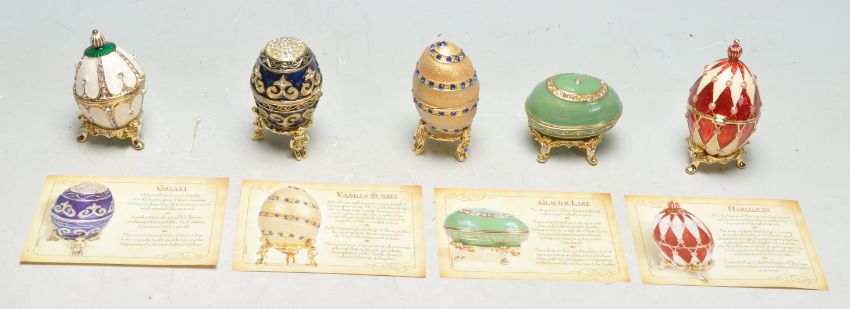 A collection of five 20th century enamel decorative eggs in the manner of Faberge  by Atlas Edition to include: Vanilla Sunset, Glacier Lake, Harlequin, Galaxy, etc. All in original presentation boxes. Measures 6cm high