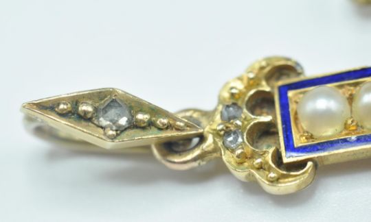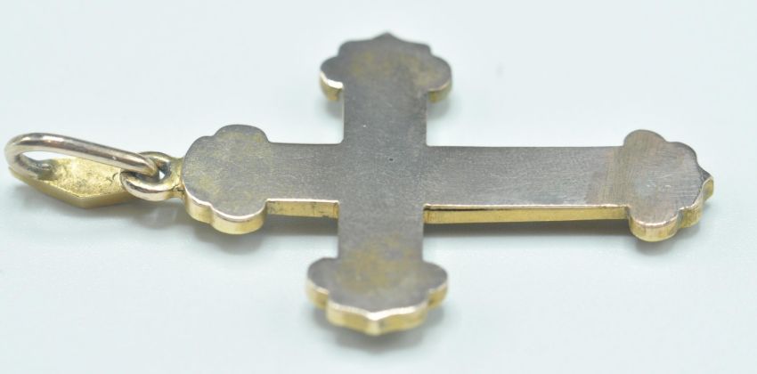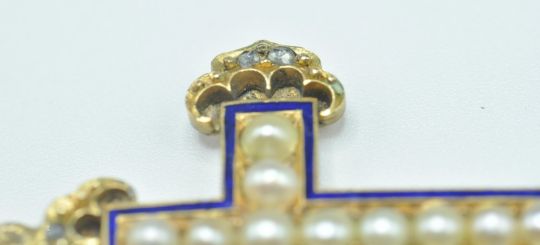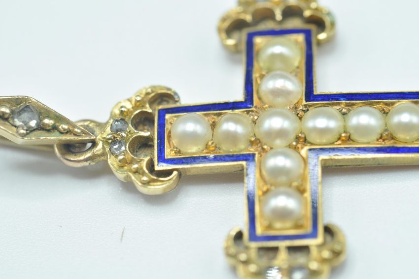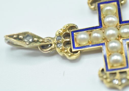 A 19th Century Victorian gold cross pendant set with half pearls and diamond accent stones, having black enamelled borders and a further diamond to the bale. Tests indicate 9ct gold. Measures approx 4.9cm including bale. Weight 7.0g.