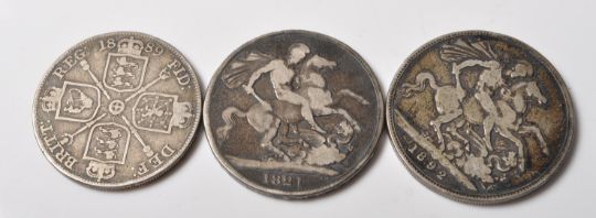 A group of three 19th Century silver coins to include an 1889 Victorian crown and an 1892 crown, both having jubilee heads to the verso, and a George III 1821 crown, the bust facing left with a leaf crown. Weight 77g.