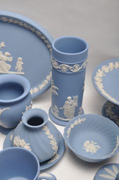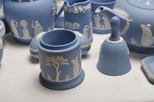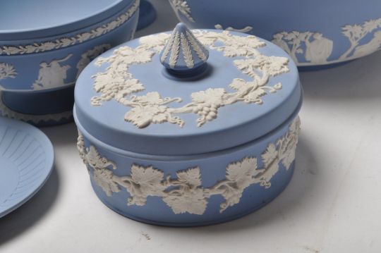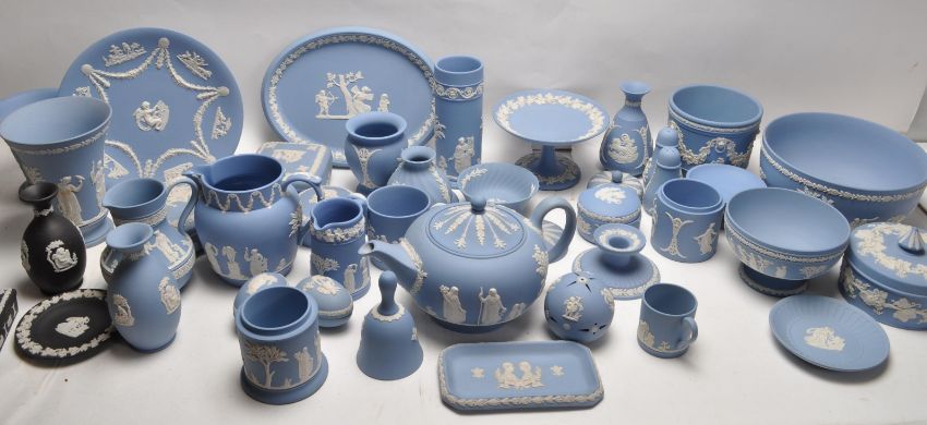 A large and impressive collection of 19th century and 20th century Wedgwood Jasperware ceramic wares to include plates , vases, cups, trinket boxes, cups, saucers, tazza central piece, oval platers, dishes, etc. All having embossed decoration with neo classical scenes. Makers marks to the underside.