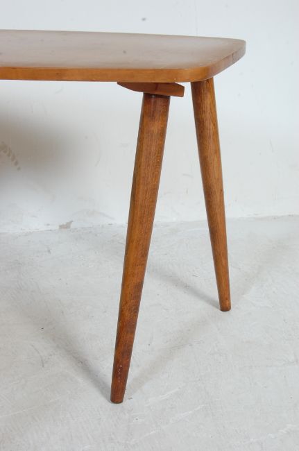 A collection of retro vintage 1970s table comprising of a white mosaic tile top coffee / occasional table raised on dansette legs, a teak surfboard table raised on teak tapering legs together with a nothe tableMeasures, 42 cm H x 67 cm W x 38 cm D