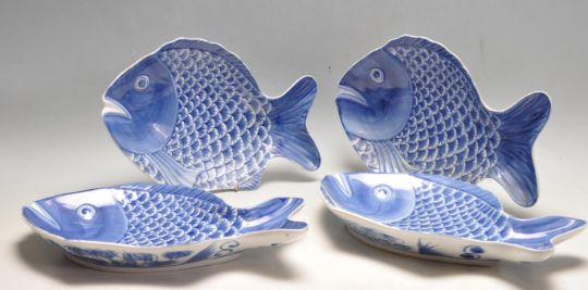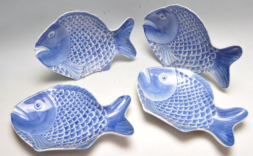 A set of four mid 20th century chinese Republic Period blue and white ceramic plates in the form of fish. Each having raised edges with geometric patterns to the underside.33cm long