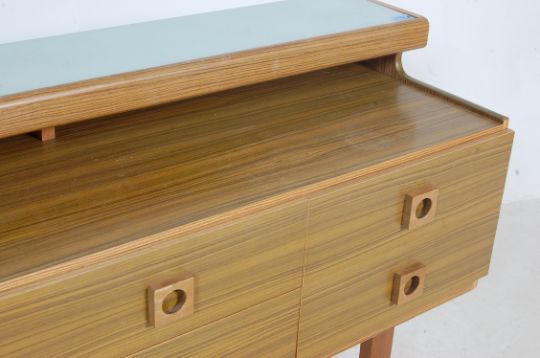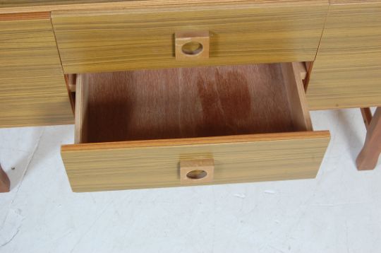 A vintage 1980’s melamine dressing table having a suspended shelf atop having milk glass / white grass top, fitted electric lights, bank of six drawers to the front with geometric wooden handles, raised on shaped supports united by stretchers.Measures, 73 cm H x 134 cm W x 42 cm D