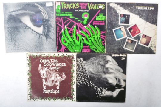 Horslips - A group of five vinyl long play LP record albums to include Drive The Cold Winter Away (Ireland Horslips stereo label MOO 9, A2 / B2 matrix endings, VG condition), The Tain (Ireland Oats stereo label MOO 5, A-1E / B-1E matrix, G+ condition), The Book Of Invasions (UK DJM stereo label DJF 20498, A3 / B2 matrix, G+ condition), Short Stories / Tall Tales (German Mercury Stereo label 9111 059, VG condition) and Track From The Vaults (Ireland Oats stereo label MOO 13, VG condition).