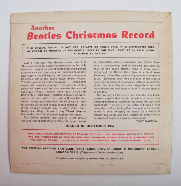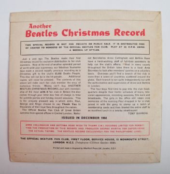 The Beatles - 1964 Christmas Flexi-Disc - A good 1964 released Beatles Fan Club Flexi Disc ' Another Beatles' Christmas Record '. Released on Parlophone LYN 757 with the original flip back sleeve. Flexi Disc condition VG+. Sleeve condition VG.