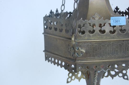 An early 20th century Moroccan / Islamic style brass ceiling hanging oil lamp having a pierced decoration with long chains being converted in electric light.