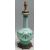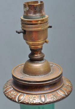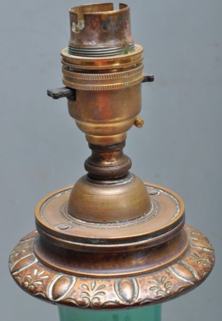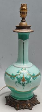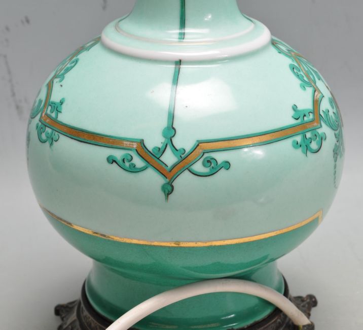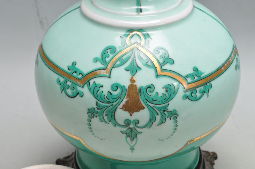 A 19th century Victorian antique Opaline glass / ceramic lamp / table lamp base of a baluster form with gilded detailing raised on a brass base being ornately decorated with characteristic periodic motifs. 43cm tall.
