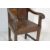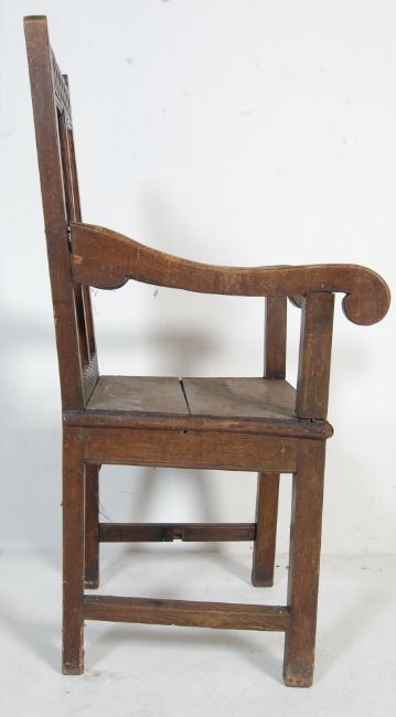 An 18th century  oak Wainscot chair / armchair. The peg jointed carved top rail having concentric arch detailing above a quarter fielded panel back. The panel seat flanked by shaped and scrolled  elbow rests. All raised on squared legs with stretchers to the sides.