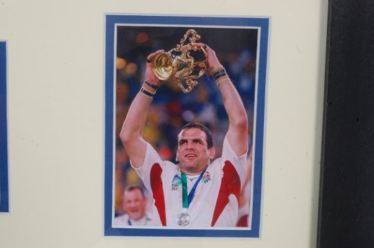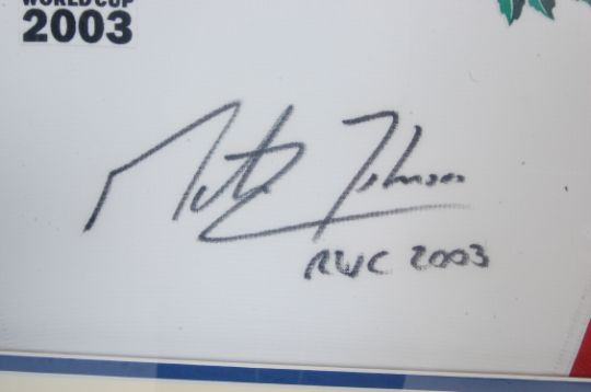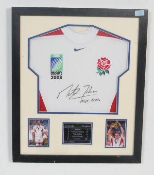 A signed rugby shirt 2003 World Cup Final Display by Martin Johnson, framed and glazed with certificate of authenticity.