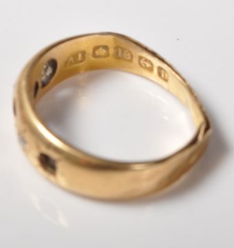 A hallmarked 18ct gold Edwardian gypsy ring with three stones missing (hallmarked Birmingham 1908, weight 1.7g,), together with an antique 9ct rose gold signet ring (marked 375, band broken, weight 4.1g.).