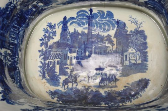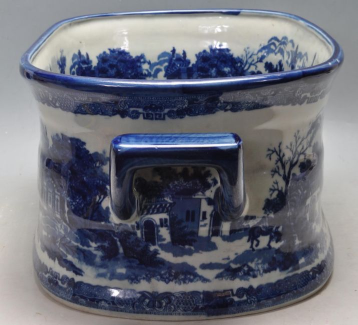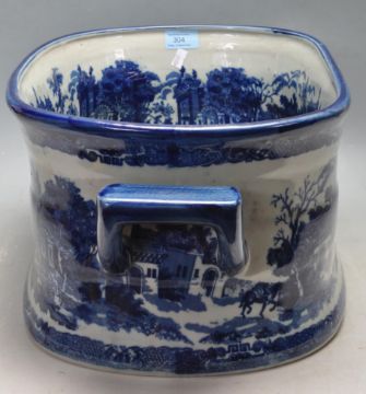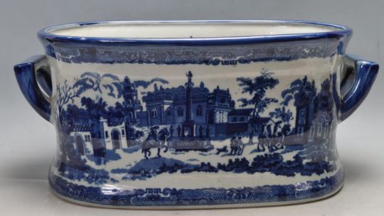 An antique Victorian ceramic blue and white foot bath of oval form with carry handles to the side. The foot bath having a fine decoration of city scenes throughout. Stamped Victorianware Ironstone to the base.