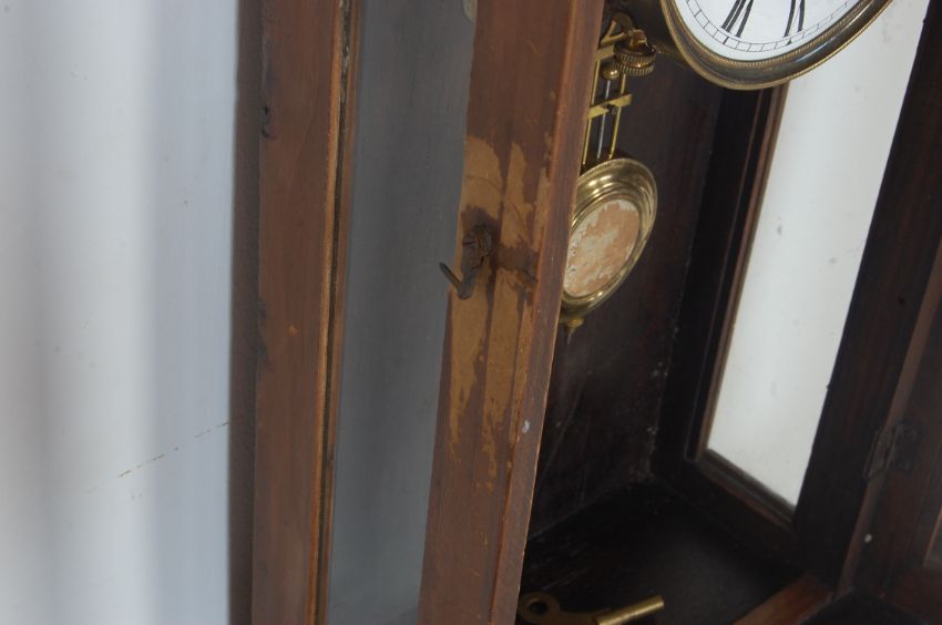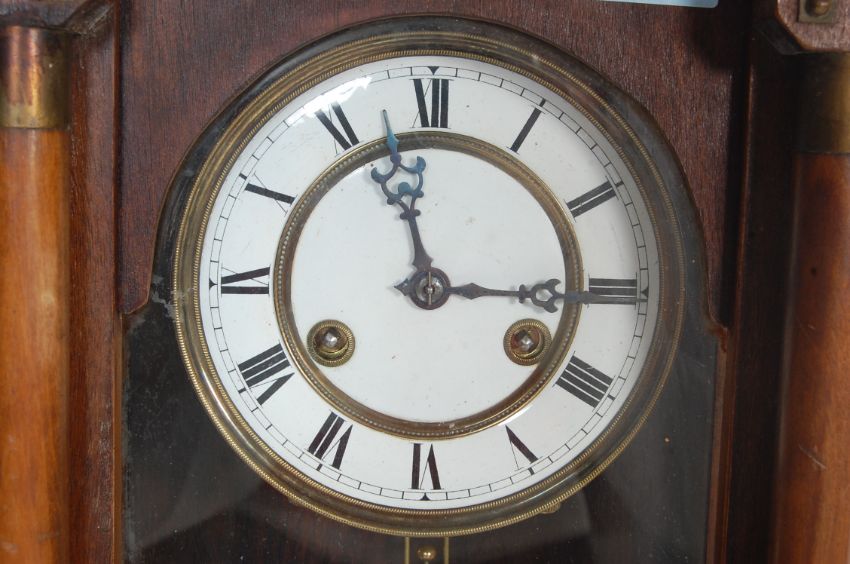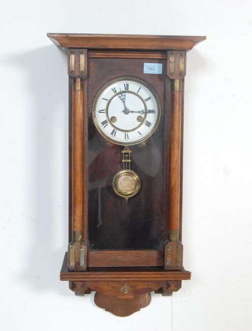 An early 20th century eight day mahogany cased Vienna style regulator wall clock having a pediment top over white enamel clock face / dial with roman numerals to the chapter ring and swin pendulum below.