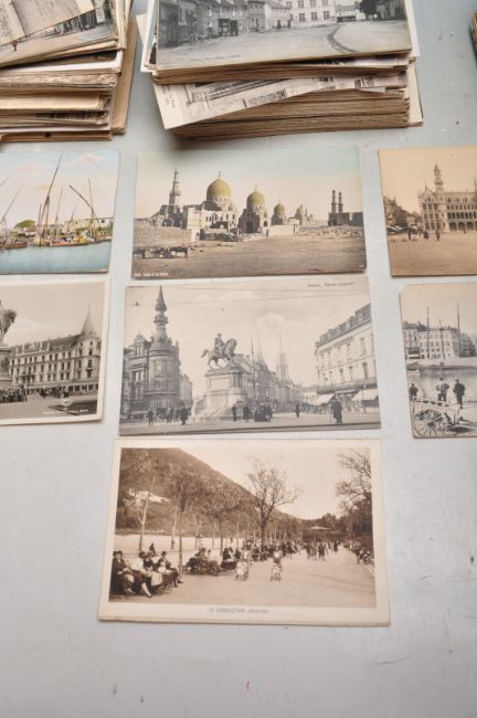 Overseas old postcards - Box of 750+ scenic views from various countries. Towns, landscapes & street scenes. All small size from antique to post 2nd war. WWI Bomb Damage noted.