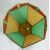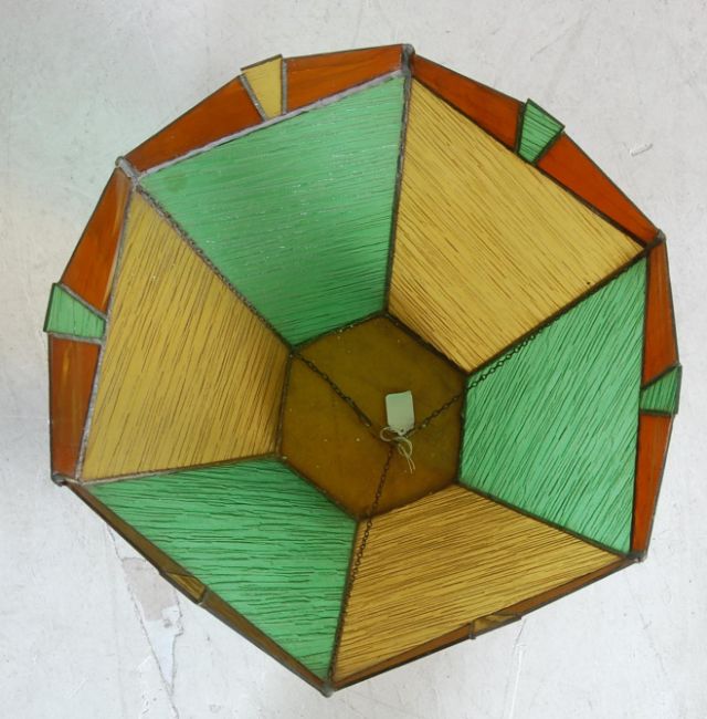 An early 20th century 1930s Art Deco stained glass pendant light shade in green yellow and orange having a lead lining with angular scalloped edges. Measures, 29 cm H x 31 cm W