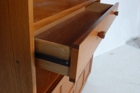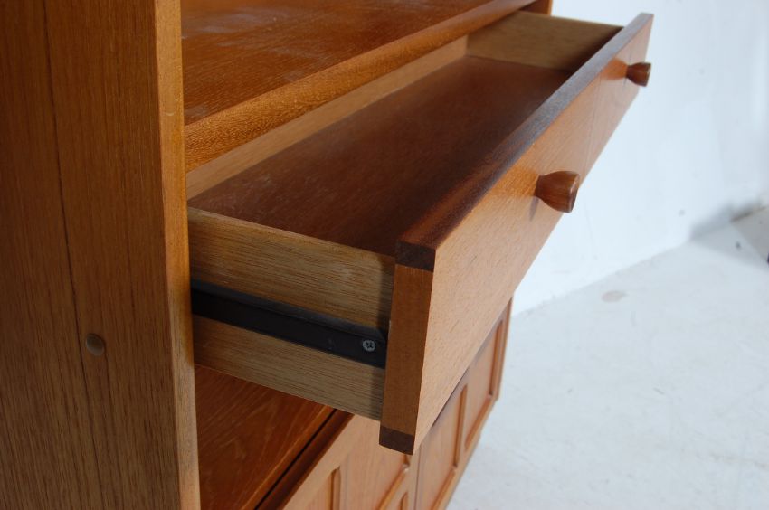 A vintage retro 20th century teak wood veneer Nathan bookcase cabinet having fixed shelves and cupboards underneath raised on a plinth base.Measures, 122 cm H x 87 cm W x 27 cm D
