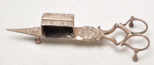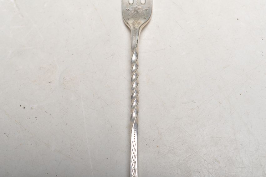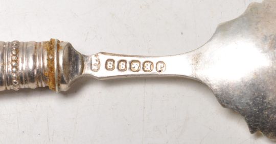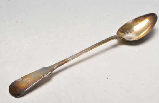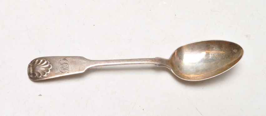 Three antique silver spoons to include two matching lily pattern teaspoons with engraved initials to the terminals (hallmarked Birmingham 1906) together with a William Marshall Scottish shell pattern spoon (hallmarked Edinburgh 1846). Weight 36g. Together with a selection of antique silver plated items including a cantle sniffer, serving spoon, flatware etc.