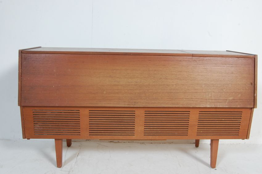 A retro vintage mid century teak wood HMV stereogram vinyl record player. The stereogram has FM/LW/MW together with a vinyl record player solid state stereogram flanked by speakers raised on square tapering legs. Model number 2342.Measures, 63 cm H x 110 cm W x 38 cm D