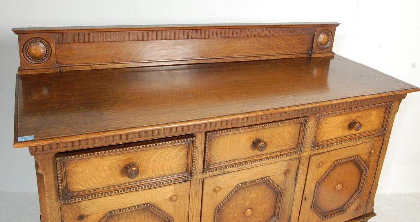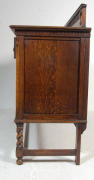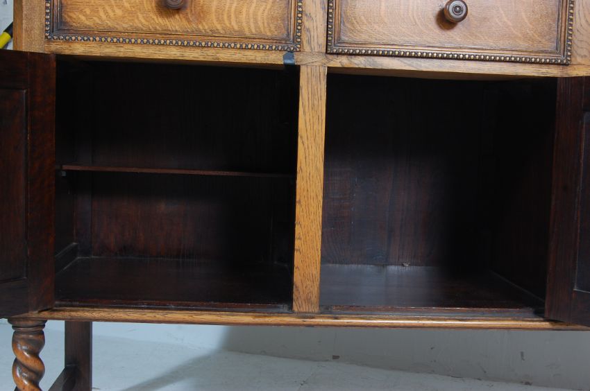 An early 20th century antique style Jacobean Revival oak sideboard having a central bank of drawers flanked by moulded door cupboards raised on barley twist legs united by peripheral stretchersMeasures, 117 cm H x 150 cm W x 56 cm D