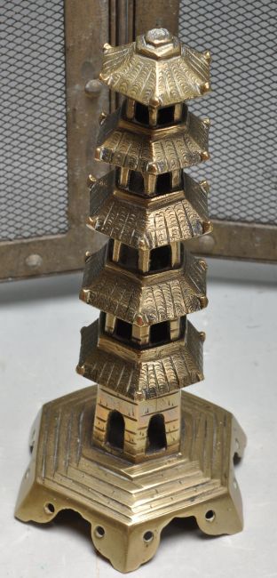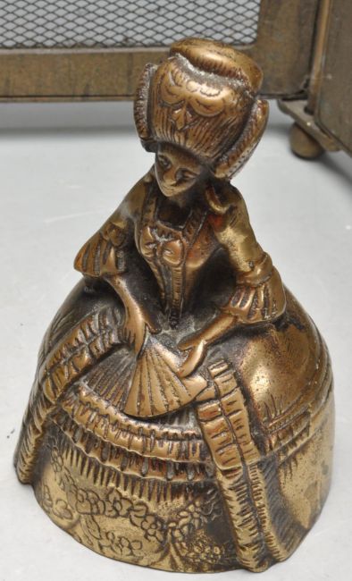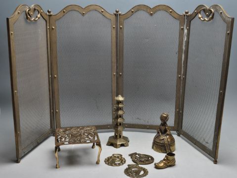 A collection of early 20th century brass ware to include a four pieces folding fire guard with dome rope, square trivet with pierced decoration, Chinese brass incense burner, brass bell in a sheave of female, etc.